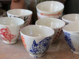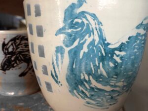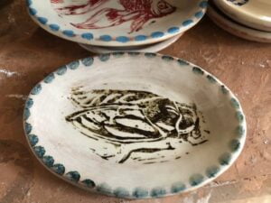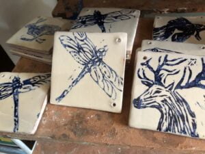 Exactement comme de la linogravure, mais sur un support souple, je grave à la gouge le dessin qui servira ensuite de tampon, appliqué sur les pièces céramiques biscuitées.