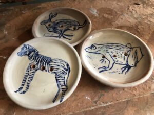 Je travaille essentiellement la terre vernissée cuite dans un four électrique.